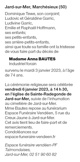 Décédée à Les Sables d'Olonne (85340, France) le mardi 3 janvier 2023 à l'âge de 74 ans